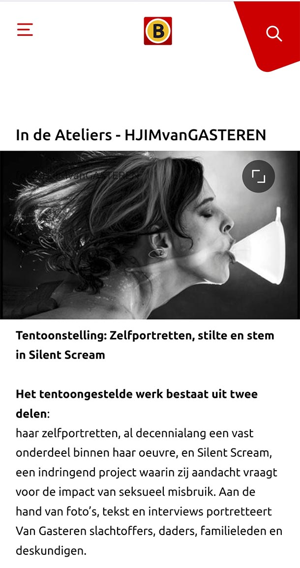 Silent Scream: kunst tegen seksueel geweld HJIMvanGasteren begon aan Silent Scream door de onmacht die ze voelde na de verkrachting van haar dochter. Met het project geeft ze inzicht, doorbreekt taboes en brengt een noodzakelijke dialoog op gang. Veel slachtoffers portretteerde ze op de plek waar het misbruik plaatsvond. Dat resulteerde in indringende foto’s met een onmiskenbare boodschap. Op de ‘na-foto’s’ is te zien wat erkenning en zichtbaarheid kunnen betekenen voor het herstelproces. Recente gebeurtenissen, waaronder het overlijden van de 17-jarige Lisa, maken duidelijk dat seksueel misbruik een onderwerp is waar continu aandacht voor moet zijn en waarover we in gesprek moeten blijven. Met Silent Scream nodigt Van Gasteren de bezoeker hiertoe uit. Mariëtte Hamer, regeringscommissaris seksueel grensoverschrijdend gedrag en seksueel geweld over Silent Scream: “een maatschappelijk gesprek in gang zetten kan en wil ik niet alleen. Daarvoor zijn heel veel partners nodig. Een van die partners is Henriëtte van Gasteren.”