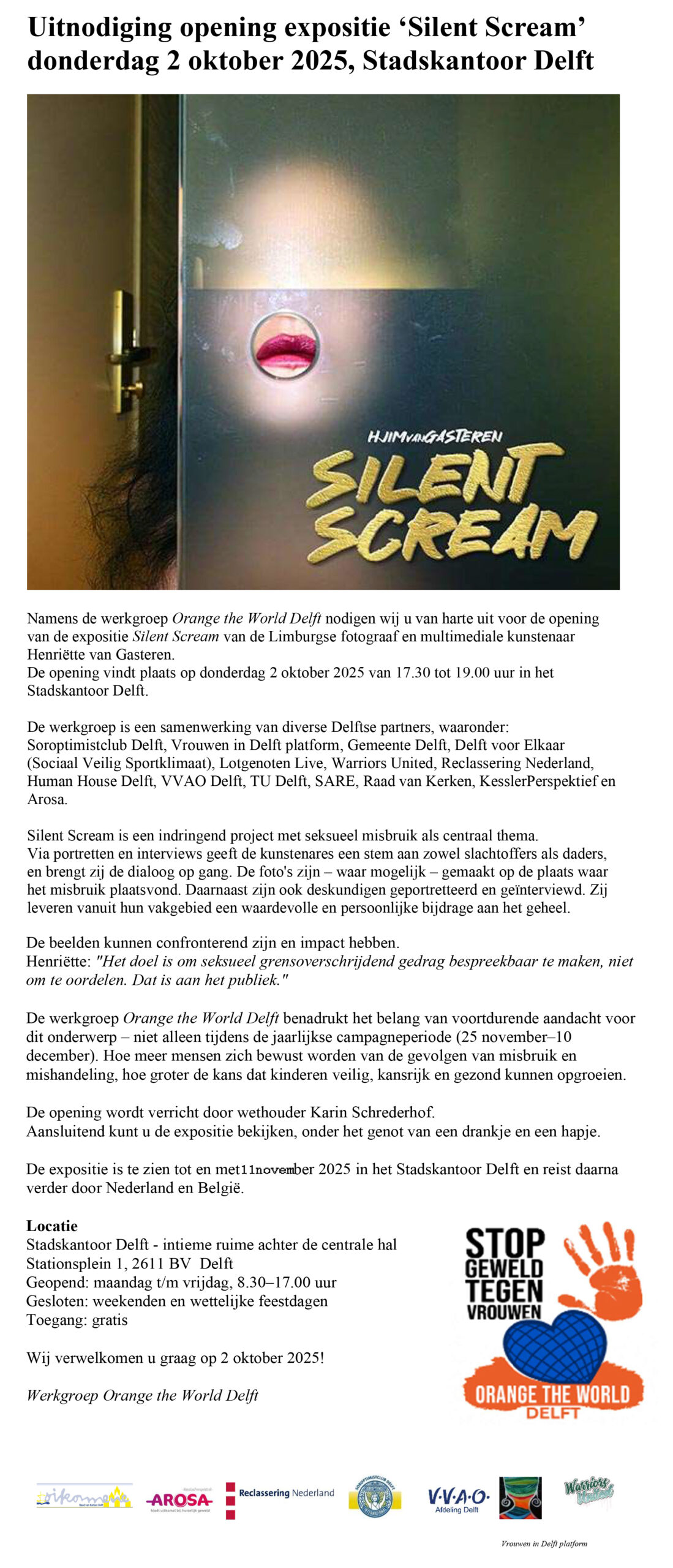 Uitnodiging expo Silent Scream 2 oktober Stadskantoor Delft