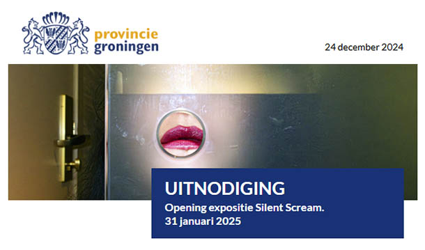 Het college van Gedeputeerde Staten van Groningen, GGD Groningen, het Centrum Seksueel Geweld Groningen-Drenthe en fotograaf/multimediakunstenaar Henriëtte van Gasteren nodigen u graag uit voor de opening van de expositie ‘Silent Scream’ op vrijdag 31 januari 2025, van 16.00 tot 18.00 uur in het Provinciehuis in Groningen. ‘Silent Scream’ is een project dat seksueel misbruik als centraal thema heeft. Deze expositie wordt gehouden in het kader van het Gronings Offensief tegen Seksueel Geweld.
