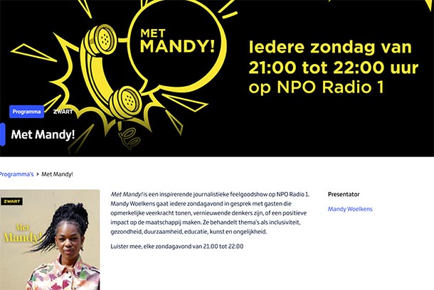 15 december 2024 waren Dr Marcia Goddard en ik te gast bij Omroep Zwart, programma ‘Met Mandy!’, een inspirerende journalistieke feelgoodshow op NPO Radio 1. Mandy Woelkens gaat iedere zondagavond in gesprek met gasten die opmerkelijke veerkracht tonen, vernieuwende denkers zijn, of een positieve impact op de maatschappij maken. Ze behandelt thema’s als inclusiviteit, gezondheid, duurzaamheid, educatie, kunst en ongelijkheid.